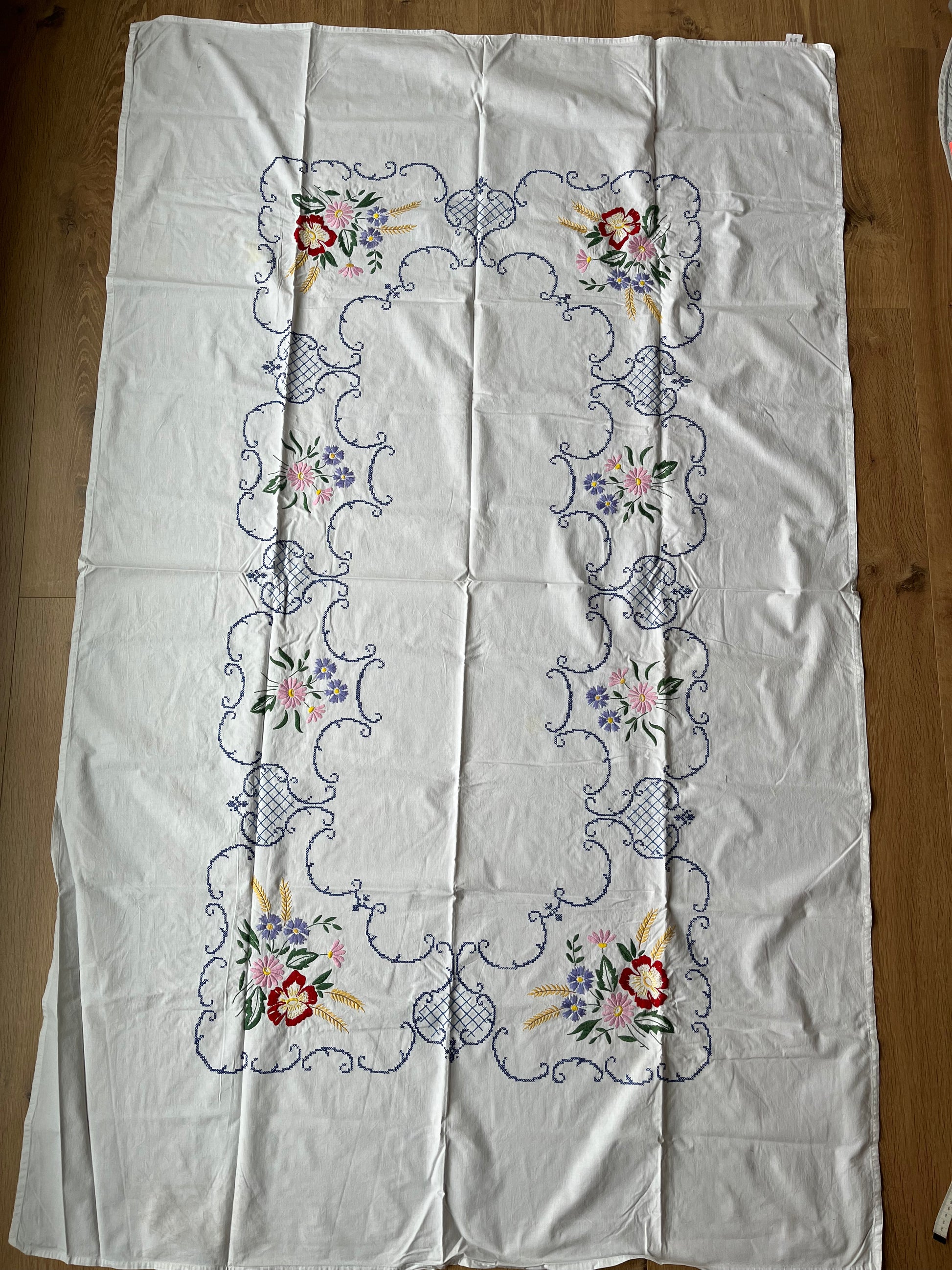 Hvid med lilla, lyserøde og røde blomster, kornakser og blåt mønster