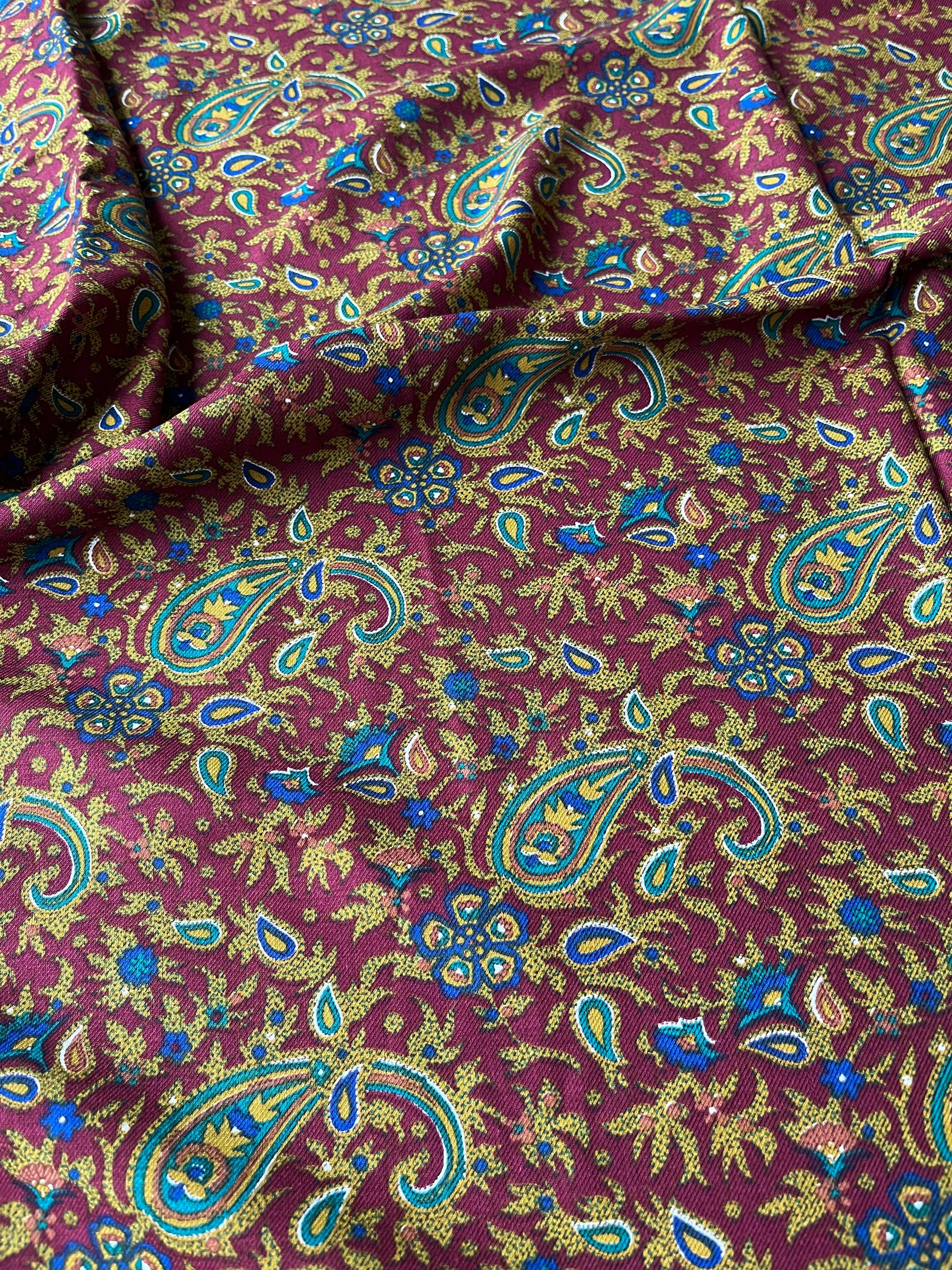 Rødbrun med blå, grønt og gult mønster, formentlig en form for viskose